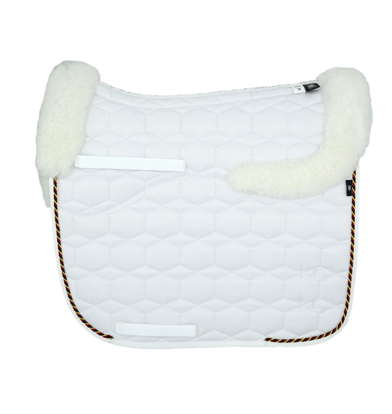 Lammfell Schabracke Dressur Gr.XL weiß Kordel schwarz/rot/gold